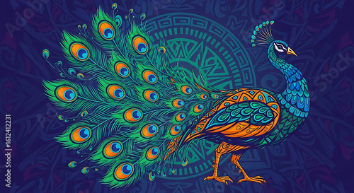 © Rhomaidhi, Fototapeta premium A detailed illustration of a peacock with intricate patterns and vibrant colors, set against a patterned background.