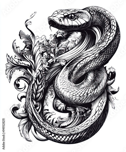 Fototapeta premium A detailed illustration of a snake entwined with floral elements.