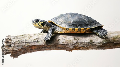 Fototapeta premium A detailed illustration of a turtle basking on a branch against a white...