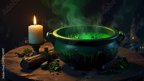 © Arief, Obraz premium a detailed illustration of a witch's cauldron filled with boiling green liquid for Halloween Background