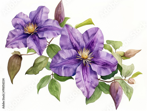 Fototapeta premium A detailed illustration of purple clematis flowers with green leaves and buds.