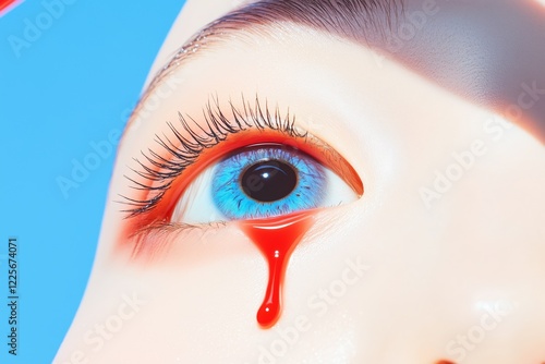 Fototapeta premium A detailed image of a blue eye shedding a dramatic red tear against a vibrant...
