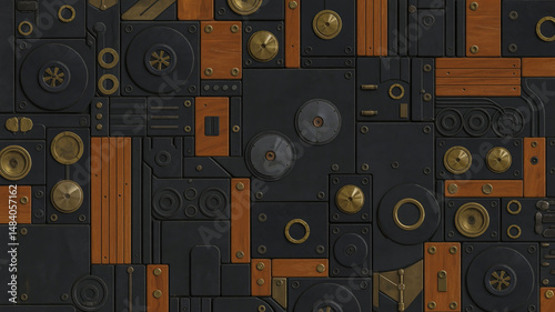 Obraz premium A detailed industrial-style collage pattern made of black metal and warm...