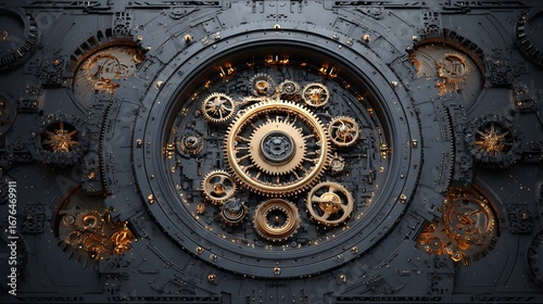 © Jojo*, Fototapeta premium A detailed, intricate, mechanical system with gears and cogs, showcasing a dark gray and gold color palette.