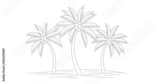 © Alfarizi, Obraz premium A detailed line drawing of three palm trees with coconuts, set against a simple ground.
