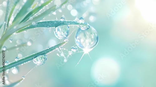 © Linlyart, Fototapeta premium A detailed macro shot of a delicate spiderweb covered in glistening raindrops. Each droplet clings to the web’s strands, catching and reflecting the light like tiny jewels. The background is blurred i