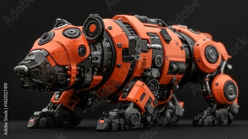 Fototapeta premium A detailed mechanical bull, characterized by its orange and black metal...