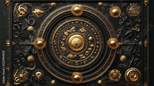 © Ariestia, Naklejka premium A detailed ornamental panel featuring a golden and black intricate design