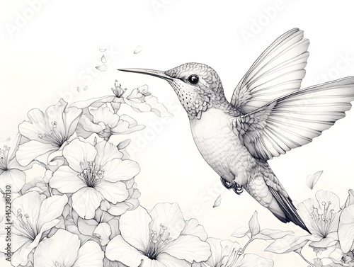 Fototapeta premium A detailed pencil sketch depicts a hummingbird in flight gracefully approaching delicate blossoms of flowers.