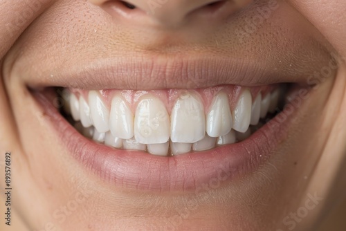 © Milos, Fototapeta premium A detailed photograph capturing a bright, straight, and healthy set of teeth, highlighting the results achievable through excellent dental care and regular maintenance.
