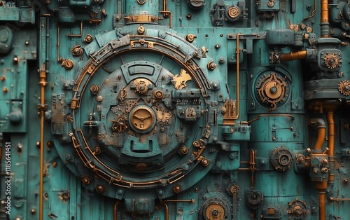 © Nattapat, Naklejka premium A detailed retrofuturistic steampunk cityscape, with industrial elements, steampowered machinery, intricate clockwork mechanisms, and a focus on horology and Victorian technology