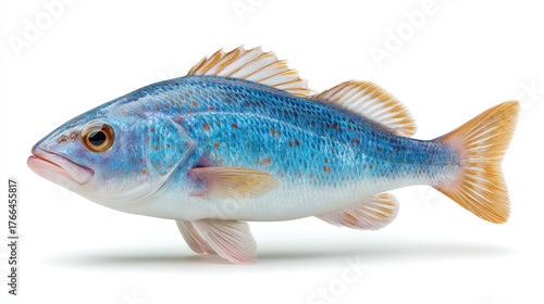 © Rati, Fototapeta premium A Detailed Sharp Studio Shot of a Bright Blue Fish with Orange Speckled Fins and Scales Against a Clean White Background with Soft Lighting