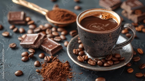 © Suphakorn, Fototapeta premium A detailed shot of a coffee cup, a scoop of coffee beans, and pieces of chocolate arranged on a dark, textured surface, highlighting the deep colors and textures of the ingredients