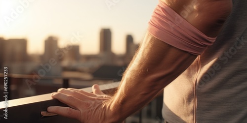 Obraz premium A detailed shot of a person's arm resting on a railing. Suitable for various...