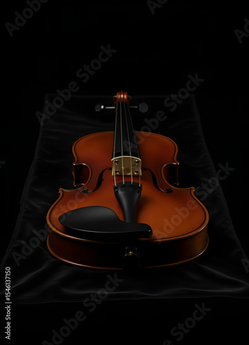 Naklejka premium A detailed shot of a violin, artfully arranged on black velvet for a classic...
