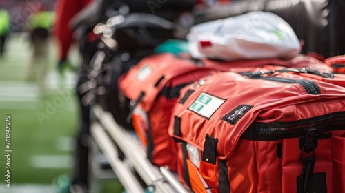 Obraz premium A detailed shot of the first aid kits stationed throughout the stadium for...