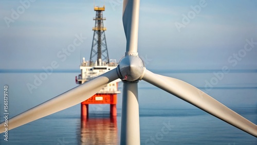 Naklejka premium A detailed shot of wind turbine blades rotating against the backdrop of a hybrid offshore rig capturing the motion and the harnessing of renewable energy amid the calm sea..
