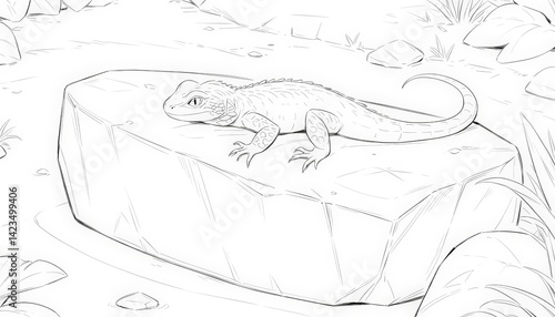 © Aliona, Naklejka premium A detailed sketch of a lizard relaxing on a rock basking in the sun, reflecting its calm behavior in its natural environment. Alphabet Letter Coloring Page