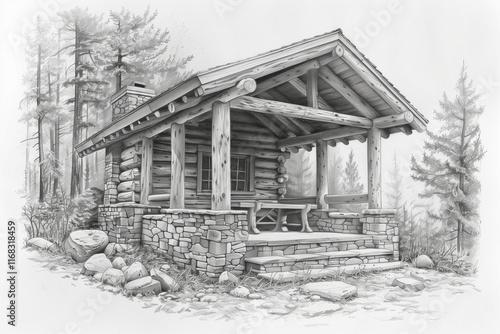 Fototapeta premium A detailed sketch of a rustic log cabin nestled among tall trees,...