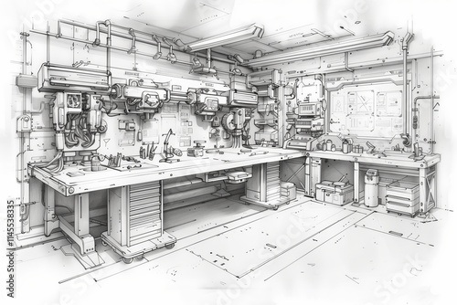 © S photographer, Obraz premium A detailed sketch of a woodworking workshop filled with tools and machinery, depicting a creative workspace.