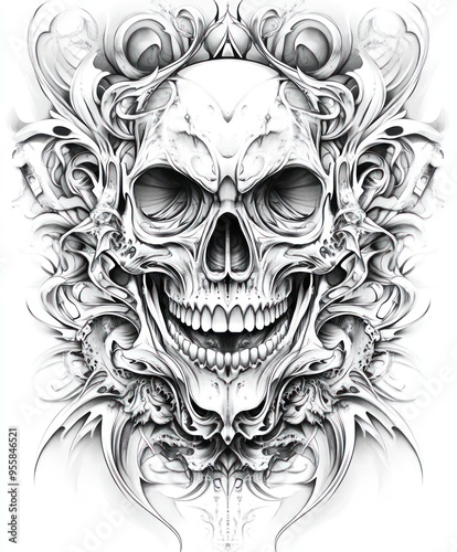 © Iswanto, Fototapeta premium A detailed skull illustration with intricate floral designs.