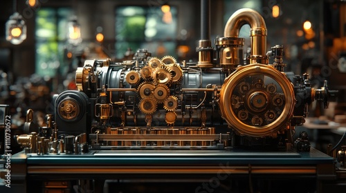 Fototapeta premium A detailed steampunk-inspired engine with intricate gears and polished metal...