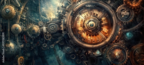 Naklejka premium A detailed steampunk-inspired illustration featuring gears, cogs, and...