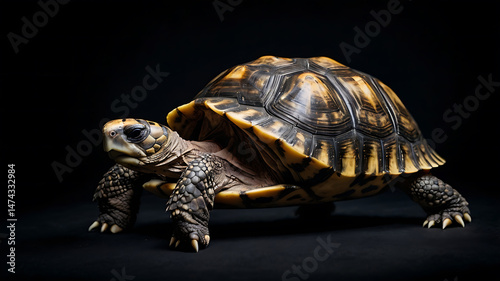 © KANAKA, Obraz premium A detailed studio shot of a beautiful tortoise against a dark background.