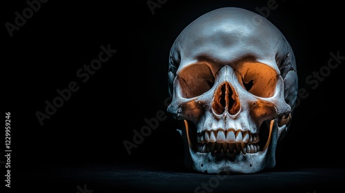 © nattapon, Fototapeta premium A detailed study of a human skull, highlighting its structure and features against a dark background, Suitable for educational materials, medical illustrations, or artistic projects,