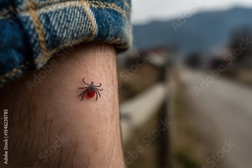 Obraz premium A detailed tick tattoo adorns a person's forearm while they stand near a...