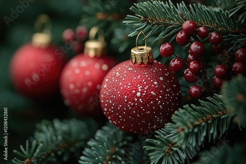 Fototapeta premium A detailed view of a bright red Christmas decoration hung on a tree, perfect for holiday-themed designs and promotions