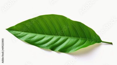 Obraz premium A detailed view of a single green leaf resting on a smooth white surface. This versatile image can be used for various purposes