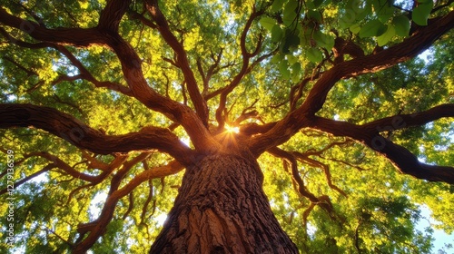 © Diffin, Naklejka premium A detailed view of a tree illuminated by sunlight filtering through its leaves, showcasing nature's beauty and intricate patterns.