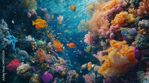 Naklejka premium A detailed view of a vibrant coral reef teeming with various species of fish,...