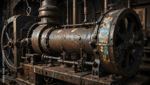 © Art Sof galery photo, Naklejka premium A Detailed View Of An Old Industrial Steam Engine Featuring Rusted Metal Components, Including Gears, Pistons, Flywheels, And A Large Cylindrical Chamber
