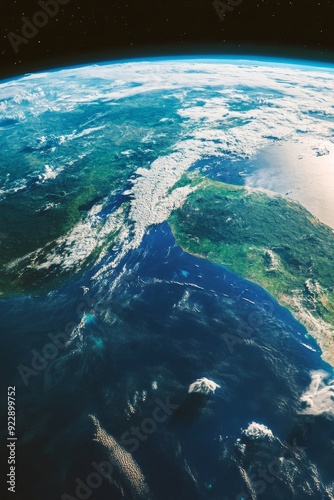 Fototapeta premium A detailed view of Earth's surface and continents from space, with lush green landscapes and vast blue oceans. The scene highlights the natural beauty and diversity of our planet as seen from above