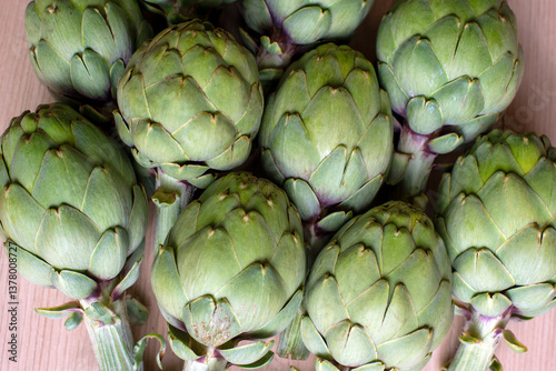 © Magryt, Obraz premium A detailed view of multiple green artichokes laid out on a table showcasing their texture. The image highlights the fresh, natural appearance of these vegetables, ideal for culinary, food, diet