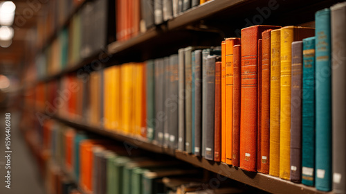 Fototapeta premium A detailed view of rows of books on a library shelf, representing education...
