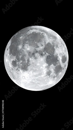 © jakiyo, Obraz premium A detailed view of the moon, showcasing its craters and textured surface against a black backdrop.