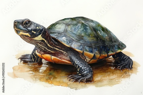 Fototapeta premium A detailed watercolor illustration of a turtle on a sandy surface.