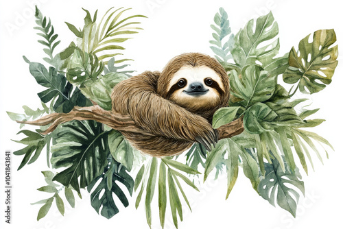 Fototapeta premium A detailed watercolor of a sloth hanging from a branch, nestled in tropical leaves and vines. The sloth brown fur and gentle expression are carefully painted, isolated on a white background for