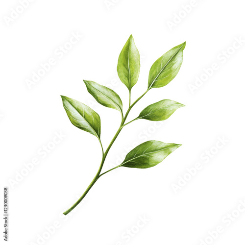 Fototapeta premium A detailed watercolor painting depicts a single green branch with multiple...