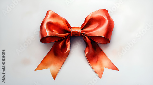 © Priyanut, Fototapeta premium A detailed watercolor rendering of a rich red bow with glittering gold trim, tied beautifully, on a white surface