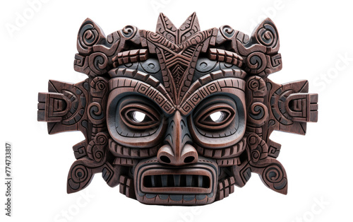 Naklejka premium A detailed wooden mask carved with intricate patterns and natural elements