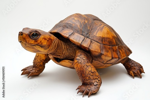 © Cloudyew, Obraz premium A detailed wooden turtle sculpture highlighting expert craftsmanship and intricate carving, set against a plain white background.