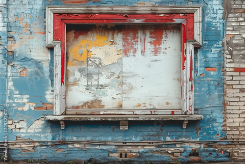 © alenagurenchuk, Naklejka premium A deteriorating building with a shattered window, showing signs of neglect and disrepair, mockup