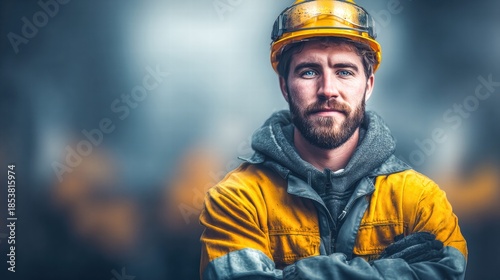 Fototapeta premium A determined construction worker with a beard, ready to build and work in the...