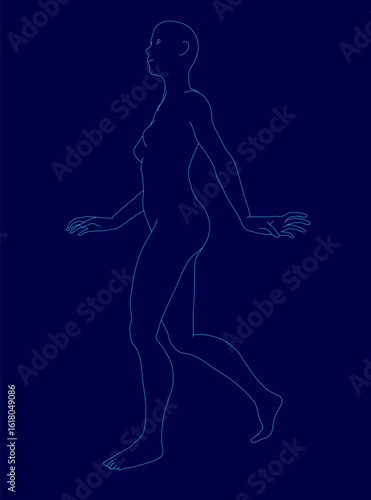 © German Ovchinnikov, Fototapeta premium A determined woman walks confidently in a blue line drawing, her arms and legs outstretched in motion. Her hair is pulled back in a neat bun, and her expression conveys focus.