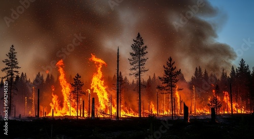 Obraz premium A devastating forest fire rages at night, with bright flames and thick smoke...