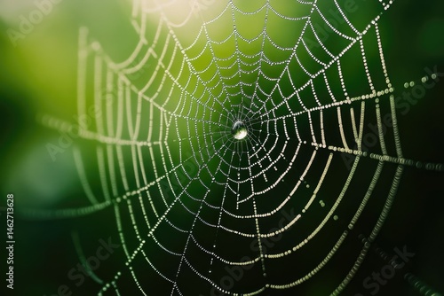 © Thimira, Naklejka premium A dew-covered spiderweb, intricate design, nature's artistry, glistening droplets.
